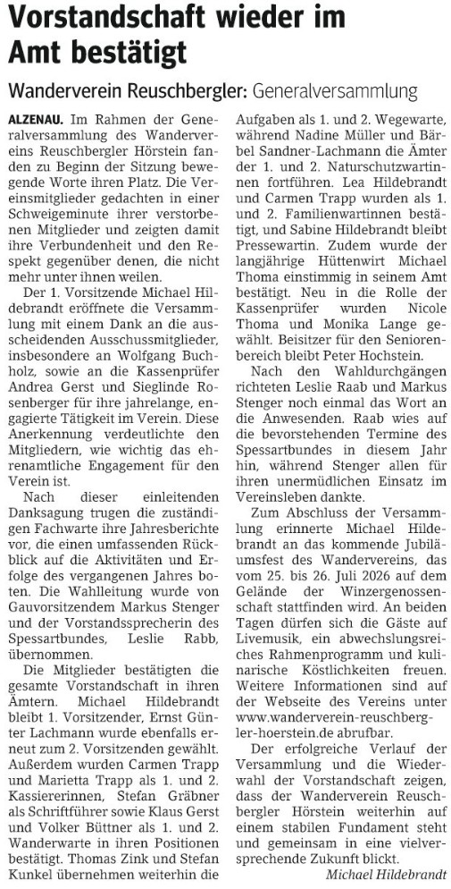 Der Wanderverein Reuschbergler Hörstein in der Zeitung.